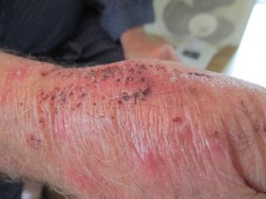 His boss insisted that he stay home today and tomorrow. We think that his wearing heavy gloves at work made the condition worse.
