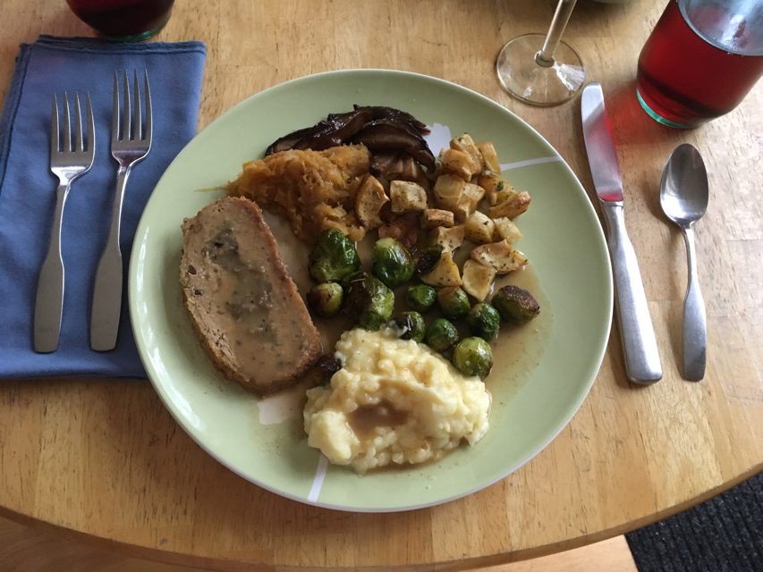 Mashed potatoes, squash, veg loaf and gravy for the rest of the meal. Pecan/pumpkin pie for dessert with coffee and brandy (rum for me).