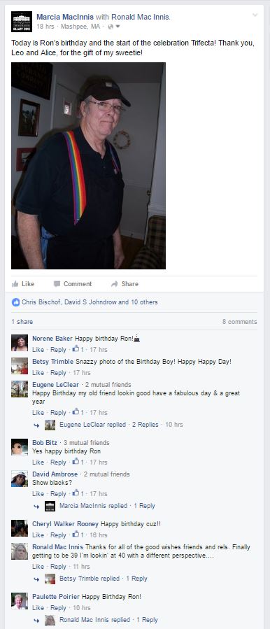 70 Years Young Posted on May 7, 2016 by thecapeblog We began Ron’s birthday Trifecta with an outstanding meal at Bobby Byrnes last evening and a “Ronald G. MacInnis I don’t wannit unless it’s free” cake from the Senior Center. Many of Ron’s friends and family sent greetings via Facebook!