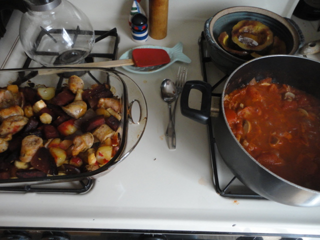 Made a train wreck and baked an acorn squash. Tomato/mushroom sauce on the stove.
